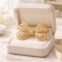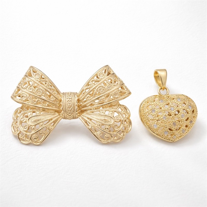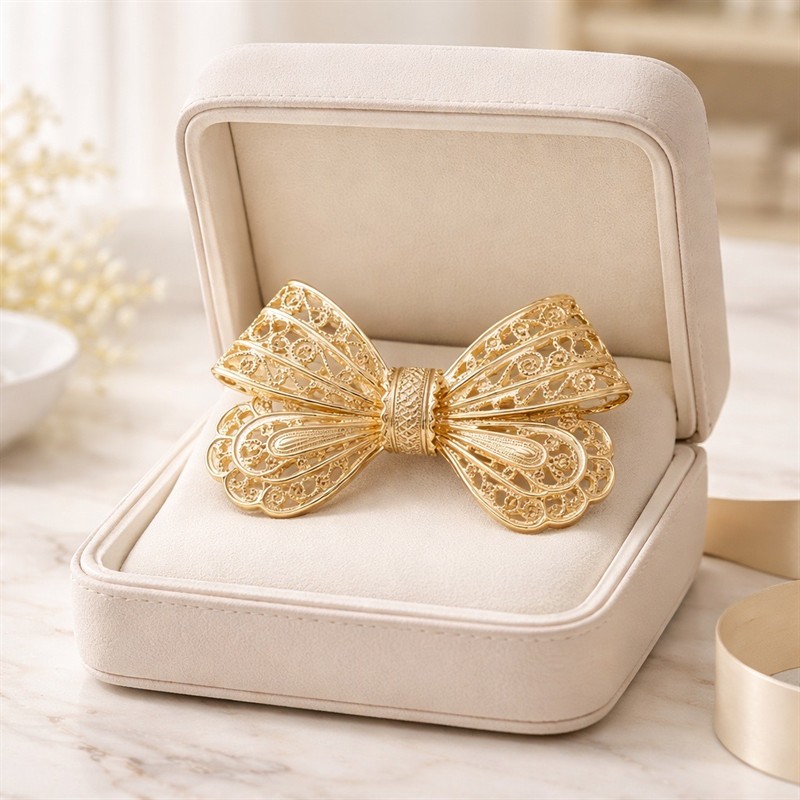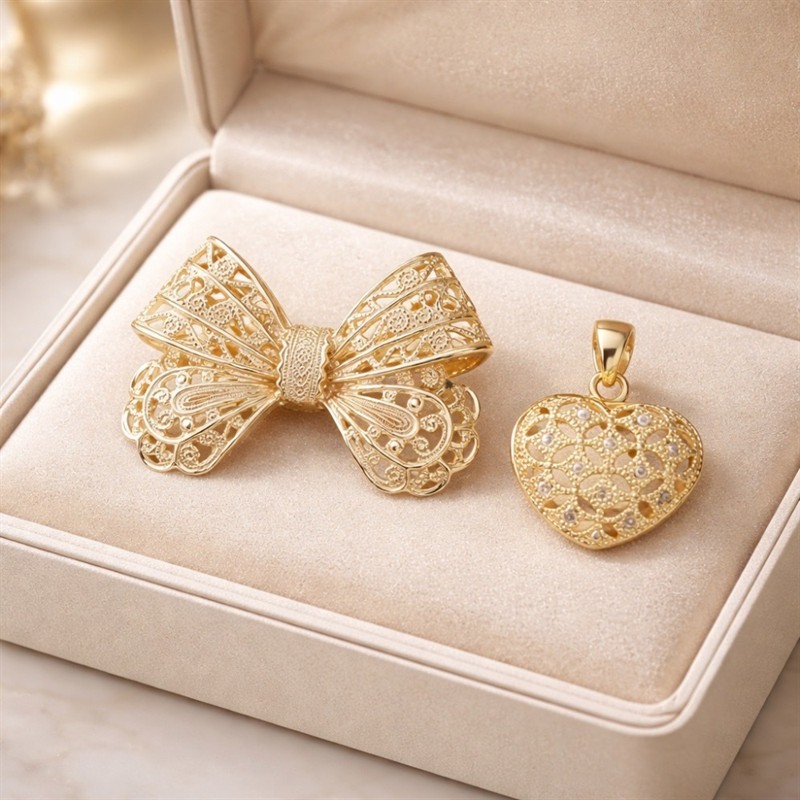 Něžný medailon s precizně zpracovaným průsvitným dekorem působí vzdušně a lehce. Na rubu i líci je zdoben 2x třinácti drobnými, decentně vsazenými zirkony, které dodávají šperku velmi jemný třpyt. Celek působí elegantně a jemně luxusním dojmem. Medailon je zhotoven ze silně zlaceného stříbra o ryzosti 925/1000, s platným puncem. Rozměry jsou cca 1,5 × 2 cm (včetně ouška), váha 3,40 g. Bez řetízku. Medailon doplňuje detailně propracovaná brož ve tvaru mašle s lehkým krajkovým vzhledem. Je zhotovena ze silně zlaceného double a vyniká střídmou elegancí. Rozměry brože cca 4 × 2,5 cm, váha 5,93 g.
