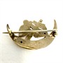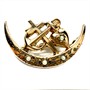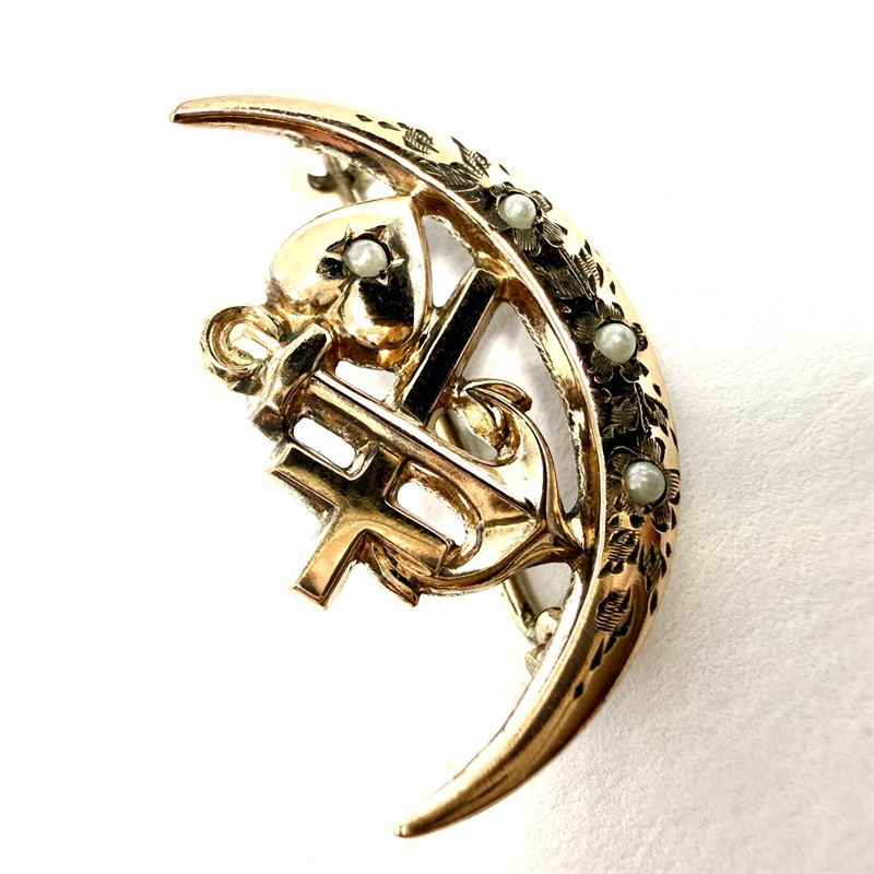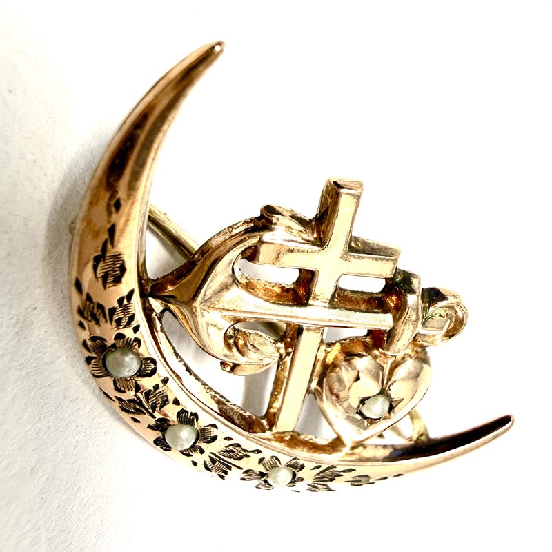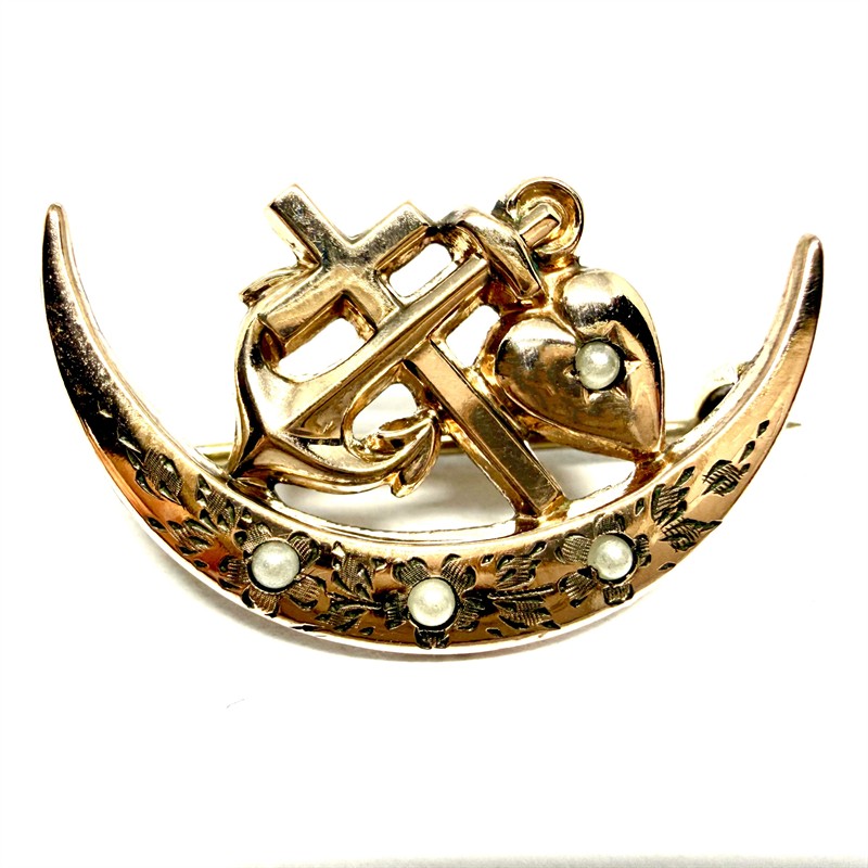 Půvabná brož ze silně zlaceného kovu tzv. double nesoucí symboly - víry, naděje a lásky. Šperk zdobí ruční rytí ve formě florálního motivu a drobné říční perly. Rozměry cca 3 x 1,5 cm. Výborný stav.