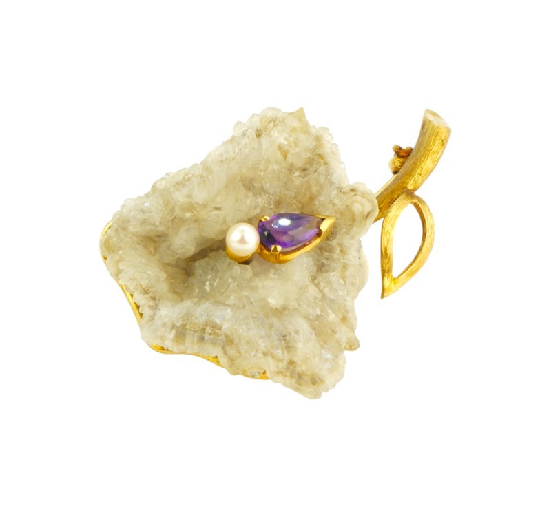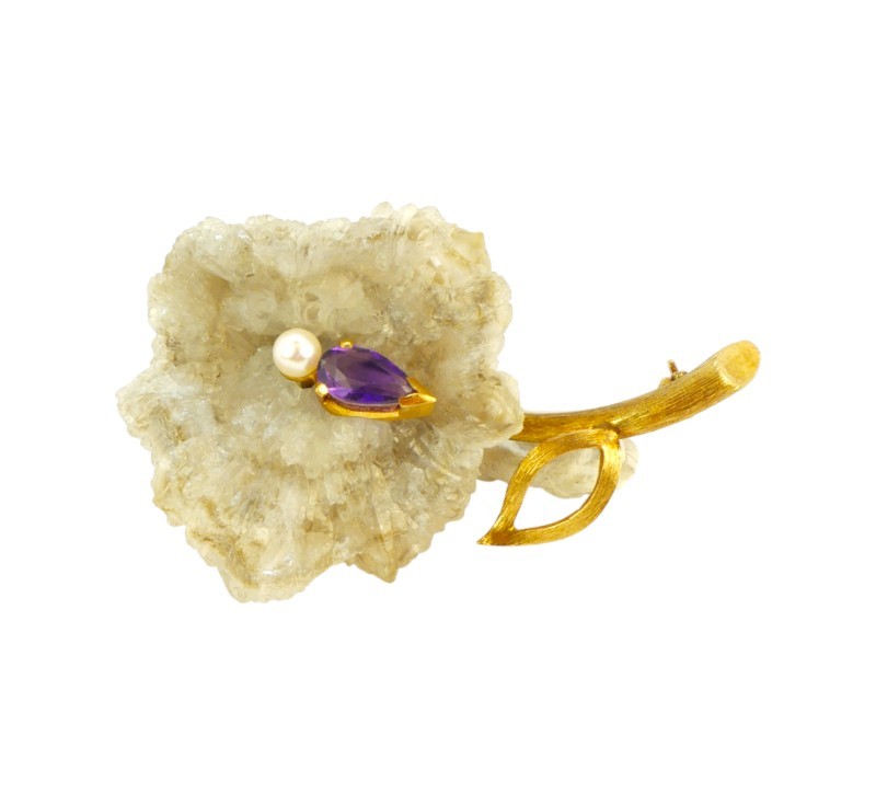 Zajímavá brož ve tvaru květu zhotoveného ze surového křemene, uprostřed jsou zasazeny drobný ametyst a perlička. Rozměry brože 4,5 x 3 cm, celková hmotnost 11,53 g.