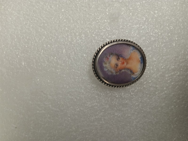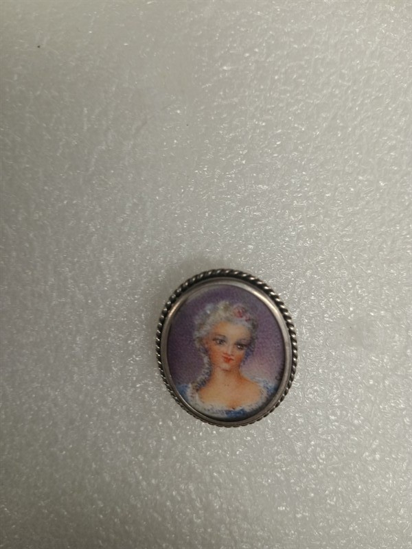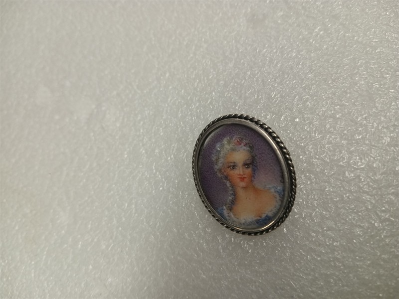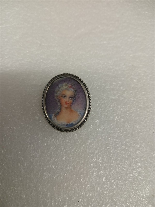 Brož vyrobena ze stříbra ryzosti 800/1000 , s malovaným portrétem dámy , signováno nečitelně . Díky očku je možné nosit na řetízku jako náhrdelní. Rozměry 3 x 2,5 cm . Hrubá hmotnost 5,61 gr.
