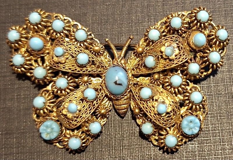 rozměr 6,5 x 4 cm, hmotnost 19 g, světle modré kameny zlatý tombak, art deco, 20. léta m.s., art deco 20. léta m.s. Originální produkci fiirmy Norbert Neiger tvoří atypické bižuterní šperky inspirované jak uměním starověkých států tak i přírodou. Koncepčně i barevně originální bižuterie se od zahájení výroby před 1. sv, válkou stala sběratelským fenoménem, a to na obou stranách Atlantiku. Její velká obliba přetrvává dodnes vedle ČR především v USA, Francii a Německu. Snadno rozpoznatelné šperky kombinují mačkané sytě barevné skleněné dílky se zlatým kovem (tombak). Jsou jedním z mála ikonických produktů stylu secese a art deco s trvalým mezinárodním přesahem . vzniklých na území Československa.