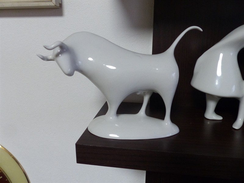 100% bez otluků, prasklin a lepení, stav podle fotek 12 x 10 x 5 cm Autorem plastiky býka je Jaroslav Ježek. Býk patří do skupiny figurek, které Ježek vytvořil v letech 1958-1959 ve Vývojovém závodě Lesov po úspěchu trojice koníků pro Expo 58 v Bruselu. Tento exemplář byl vyroben v duchcovské porcelánce v šedesátých až sedmdesátých letech. Býk byl vyráběn velmi omezeně - pravděpodobně díky velmi tenkým nohám a ocasu, které se při výpalu deformovaly.