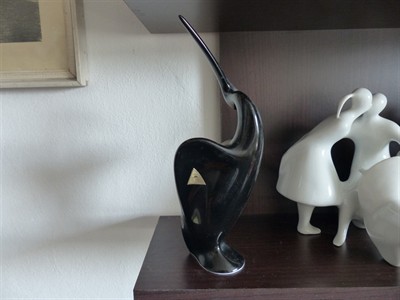 100% bez otluků, prasklin a lepení, stav podle fotek 21 x 10 x 10 cm Figurku pelikána vytvořil Jaroslav Ježek na přelomu padesátých a šedesátých let. Figurka stojí na kulatém soklu, který vlastně tvoří ptákovy nohy a zadní část křídel, které se slévají v jednotný celek. Pelikán je načepířený, ukazuje křídla, je pravděpodobně zachycen v situaci, kdy se předvádí před samičkou, připadně před sokem. Hrdé gesto dotváří na stranu ohnutá hlava a vztyčený zobák. Jak je pro autorovu tvorbu typické je figurka prostá všech zbytečných detailů, což jen zvyšuje její emocionální účinek. Jinak zcela bílou figurku ozvláštňuje fialový pruh na vrcholku hlavy.Tato figurka byly užita na fotografii katalogu výstavy Bruselský sen.