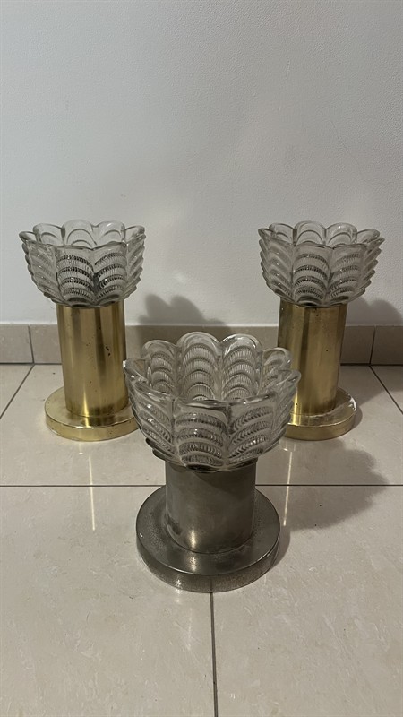 Umělecký design - Brutalismus, 3x stropní svítidlo, kombinace mosaz, nikl, sklo, velmi moderní přelom 70/80let, kompletní a plně funční včetně objímek. Vzácně se vyskytujíci design, výška 2x 27cm a 1x 21 cm.