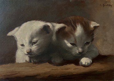 R. Budský (*1887) - Koťátka, olej / karton, rozměr 20 x 30 cm, signováno, na zadní straně autorský štítek. Krásná práce malíře podobizen a žáka pražské Akademie u prof. Hynaise. Nerámováno.