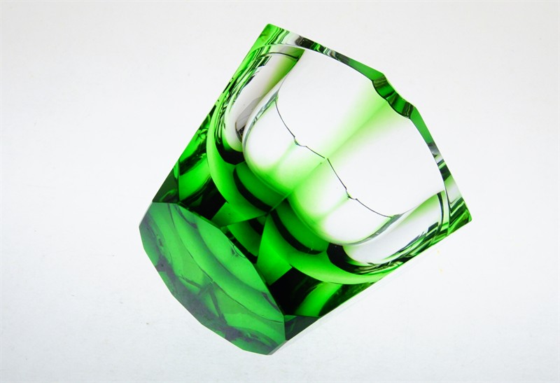 Masivní popelník - kombinace čirého skla s odstínem Oceanit. Luxusní sklo celoplošně broušené a leštěné do širokých fazet, vespod značka sklárny. Autorem návrhu kolem roku 1970 je pedagog, sochař a sklářský výtvarník Oldřich LIPSKÝ (*1922 +1987). Provedla sklárna EXBOR Nový Bor. Dobrý stav, rozměr v. 9cm, prům. 13cm