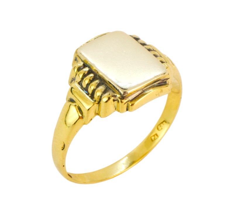 Prvorepublikový prsten vyrobený ze žlutého zlata ryzosti 585/1000 (punc lvíček). Zlatá tabulka může být využita k vyrytí monogramu - její rozměr je zhruba 10 x 7 mm. Velikost prstenu je 58, celková hmotnost 2,28 g.