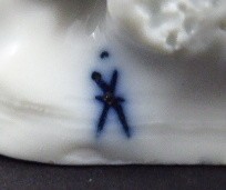 Bílý porcelán. Podle předlohy francouzského sochaře: Jean-Baptiste Pigalle (1714-1785). Výrobce: Edmé Samson, Paris. Sousoší z bílého porcelánu dle sochy Jeana-Baptista Pigalle představující dva cherubíny s ptáčkem. Starší zpola klečící andílek drží v ruce ptáčka a menší sedící cherubín mu ukazuje na otevřenou malou klec připravenou pro bílého opeřence. Na reliéfním stylizovaném podstavci oválného tvaru. Mírně poškozená klícka a opravované prsty u jedné nožky sedícího andílka. Značeno vzadu na soklu: modrou značkou a značeno zespodu: čísla a vtlačené písmeno S. Francie, Paříž 1875 - 1910. Výška 15 cm, šířka 14 cm, hloubka 13 cm a rozměr podstavce 12 cm x 10 cm.