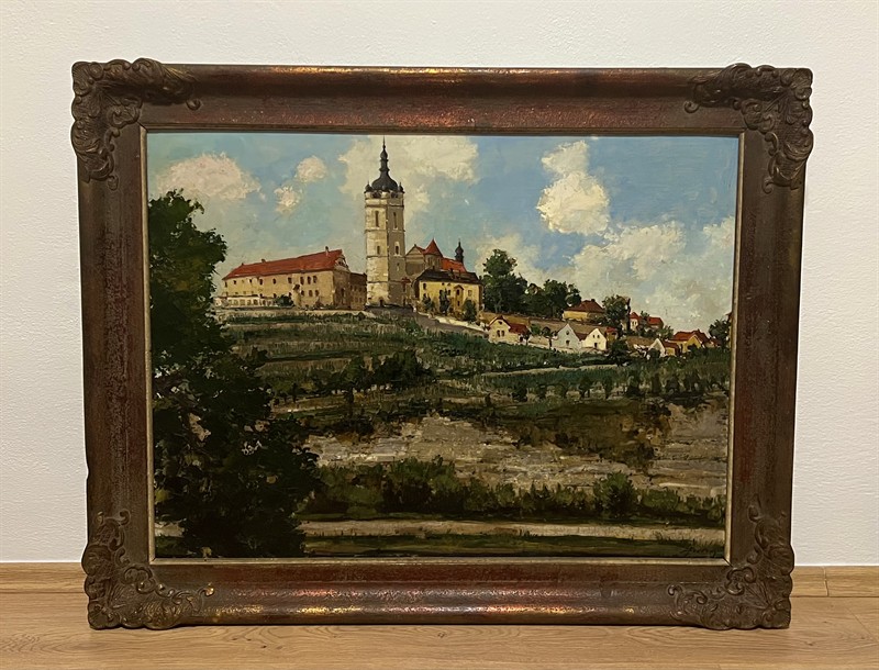 Č. Choděra (*1881) - Mělnický zámek s vinicí, olej na plátně / karton, rozměr 60 x 80 cm (80 x 100), rámováno v nádherném slohovém rámu, signováno a datováno, na rubu výstavní razítko J.U.V. Výborný krajinář, studia v Paříži na Académie des beaux-arts a soukromě u M. Utrilla. Na doporučení J. Dědiny a É. A. Bourdella se stal řádným členem "Société des artistes décorateur". V Paříži se umělecky stýkal také s A. Rodinem a Toulouse - Lautreckem. V roce 1910 podnikl uměleckou cestu do Londýna a po opětovném pobytu v Paříži se roku 1911 natrvalo vrátil do Prahy, kde působil mimo jiné jako přední člen Jednoty umělců výtvarných. Před první světovou válkou procestoval Německo, Rakousko, Švýcarsko, vystavoval v Praze a též v zahraničí, třeba v Kodani, Vídni, Oslu a Stockholmu. Krásné sbírkové dílo v perfektním stavu z roku 1936.