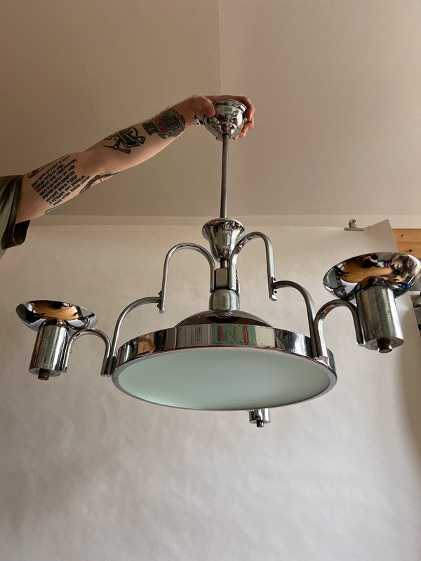 Chrom v původním stavu viz fotografie Nová elektroinstalace - všechny objímky na žárovky funkční. 3x žárovka směrem nahoru s ozdobným talířkem 1x žárovka uprostřed směrem dolů (nad mléčným sklem) Mléčné sklo nové bez poškození Celoková výška 60cm Průměr talíře se sklem 35cm Lust je poměrně subtilní vhodný i do místnosti s nízkým stropem.