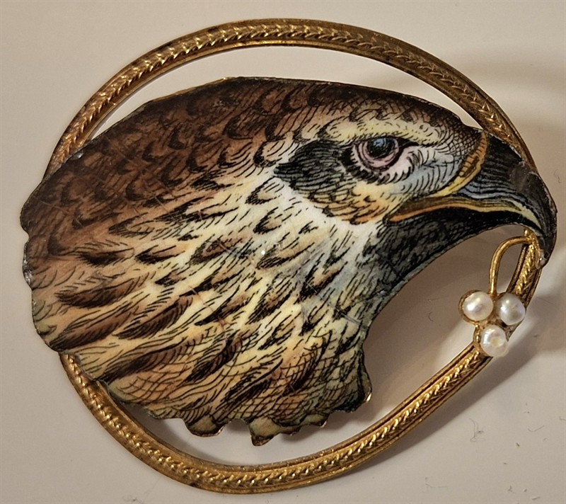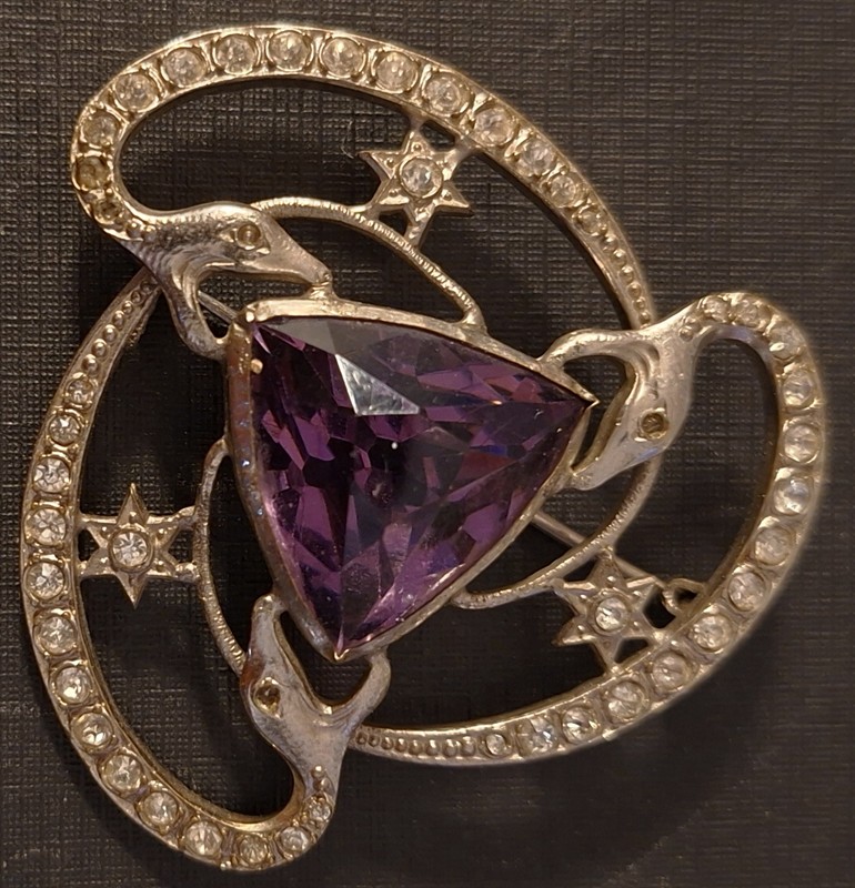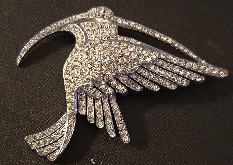 Štrasová brož - pták, art deco, jablonecko 20. léta m.s., štrasové kameny, bílý kov, rozměr 5,5 x 7 cm, hmotnost 21 g, art deco intaktní stav, Smaltová brož - hlava dravce držící v zobáku snítku s perličkami, zlatý kov, rozměr 4,5 x 4 cm, hmotnost 11g,, 20 léta m.s. art deco intaktní stav, Brož ve tvaru orlí hlavy - vybroušená z přírodního materiálu (zub, dráp?), rámovaná dubovou ratolestí, obecný kov, počátek 20. let m.s., art deco, rozměr 4 x 1,5 cm, 6 g Mysteriozní brož se třemi hvězdnými hady pohlcujícími fialovou hvězdu, art deco, Jablonecko, 20. léta m.s. rozměr 5 x 5 cm, hmotnost 18 g, štrasové kameny, centrální fialový kámen vybroušený do trojúhelníku, bílý kov, intaktní stav