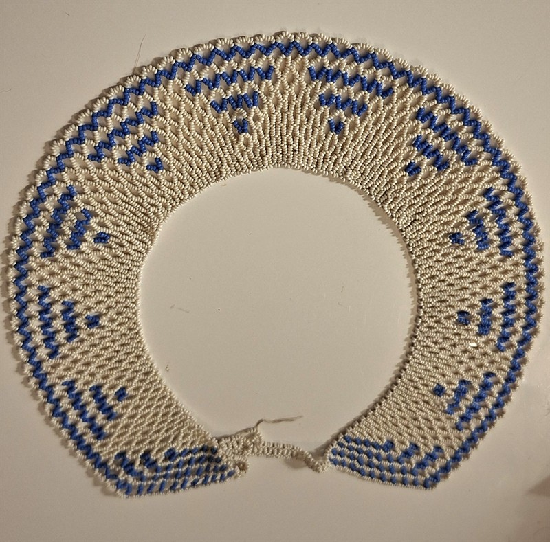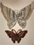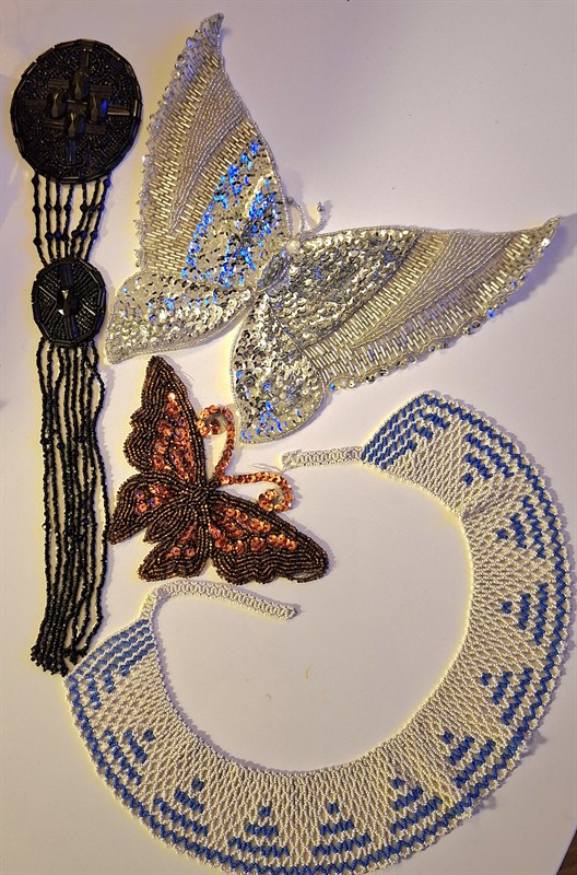 Velká aplikace z černých korálků a tyčinek, Jablonec n/N, rozměr 36 cm x 7,5 cm, hmotnost 45 g, firma Gebruder Faix, art deco, počátek 20. lét m.s Velký stříbrný motýl s korálky, tyčinkami a flitry, Jablonecko, rozpětí 25 cm, výška 21 cm, hmotnost 48 g, art deco, 20. léta m.s. Menší zlatý korálkový motýl s korálky a flitry, Jablonecko rozpětí 15 cm, výška 9 cm, hmotnost 16 g, , art deco 20. léta m.s. Modro bílý korálkový límec, Jablonecko, délka 55 cm, šířka 5 cm, hmotnost 54 g, art deco 20. léta m.s
