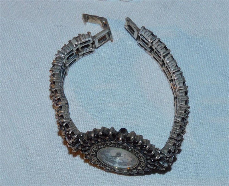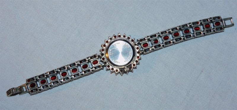 Dámské náramkové hodinky - stříbro, punc. značka + ryzostní 925, strojek Quartz, délka celkem 18 cm. Osazeno 105 almandiny a 25 markazity. Zadní strana strojku značena Stainless Steel Japan. Perfektní stav, funkčnost nezkoušena. Vyrobeno asi v poslední čtvrtině 20. století.