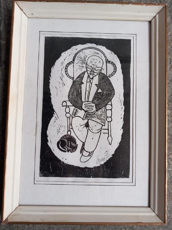 Dědek s černou kočkou je originální grafika podepsaná vpravo dole tužkou Syrový a datovaná rokem 1986. Obrázek měří včetně rámu 34 x 24 cm a vlastní tisková plocha grafiky měří 24 x 16 cm.