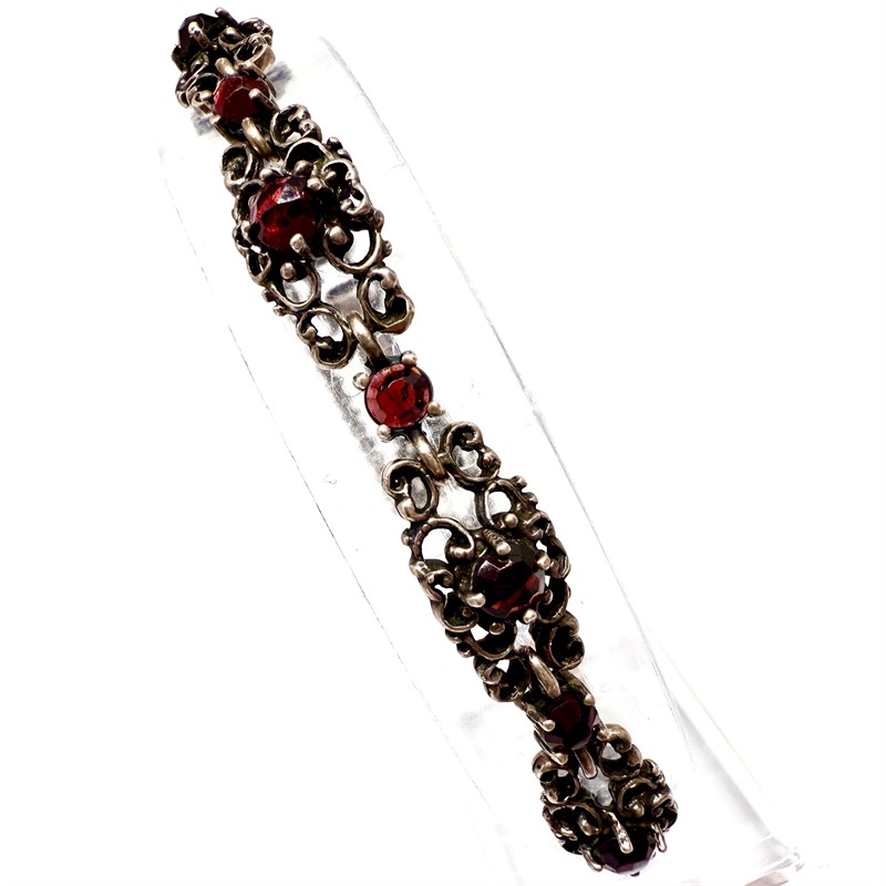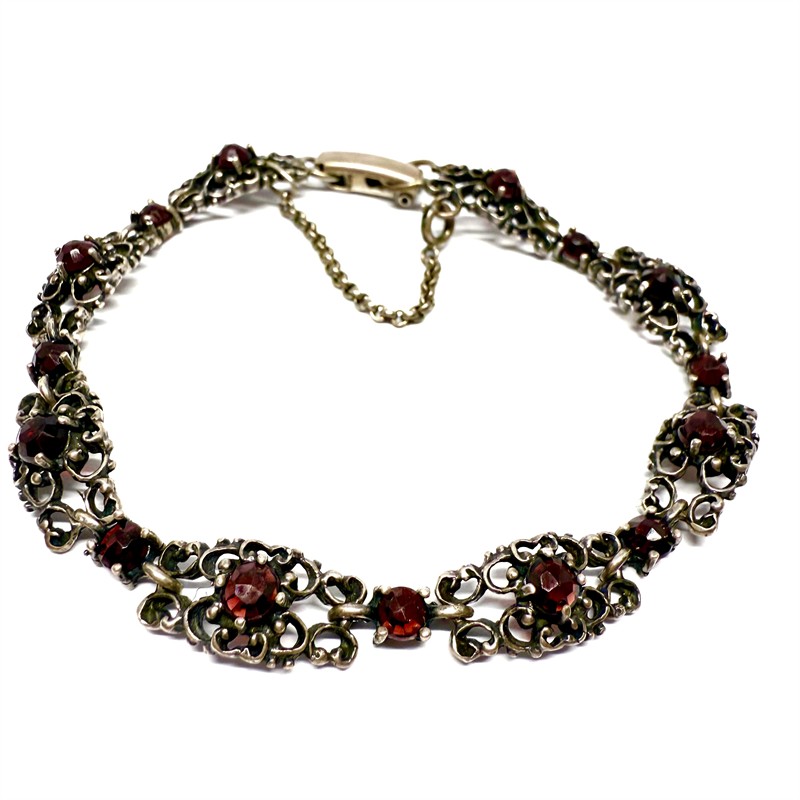 Jemný, dekorativně zdobný, článkový náramek. Šperk byl vyroben ze sterlingového stříbra (925/1000), o celkové váze 15,07 g. Každý z jednotlivých článků zdobí almandin pečlivě zasazený do krapen. Přítomen pojistný řetízek proti ztrátě. Délka 19 cm, šířka 7 mm. Výborný stav.