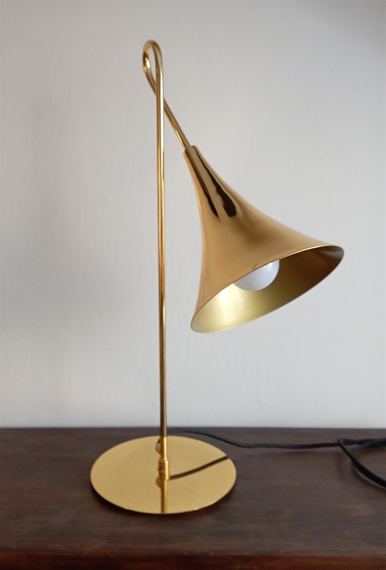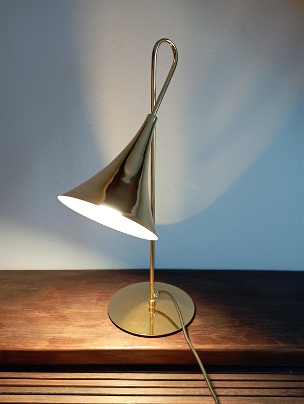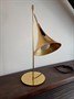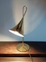 Stylová stolní lampa inspirovaná tvarem klasické trumpety a trombónu, designer Santiago Sevillano, španělský výrobce Mantra. Celokovová konstrukce, rozměry výška 58cm, šířka 21cm, hloubka 32cm. Osazena LED žárovkou s barevnou teplotou teplá bílá, perfektní stav a vzhled.