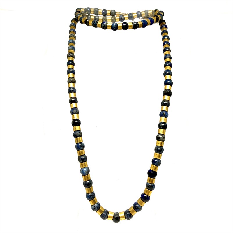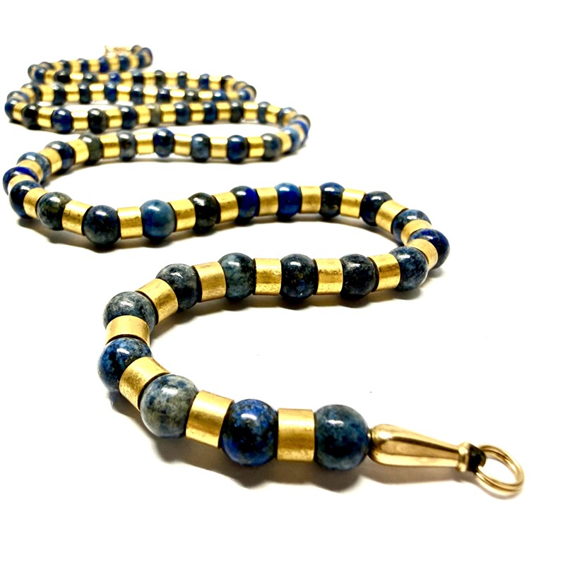 Výrazný, designový náhrdelník. Šperk tvoří kombinace modrošedých kuliček lápisu lazuli s kontrastně zlacenými kovovými články. Délka 62,5 cm. Originální, ateliérový šperk v perfektním stavu.