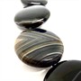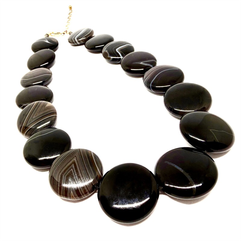Originální náhrdelník zhotovený z tmavých achátů s elegantní kresbou. Jednotlivé kameny mají průměr 2,2 cm, délka náhrdelníku 40 cm plus prodlužovací řetízek. Šperk je ukončen zapínáním (karabinou) ze zlaceného stříbra sterlingové ryzosti (925/1000). Výborný stav.
