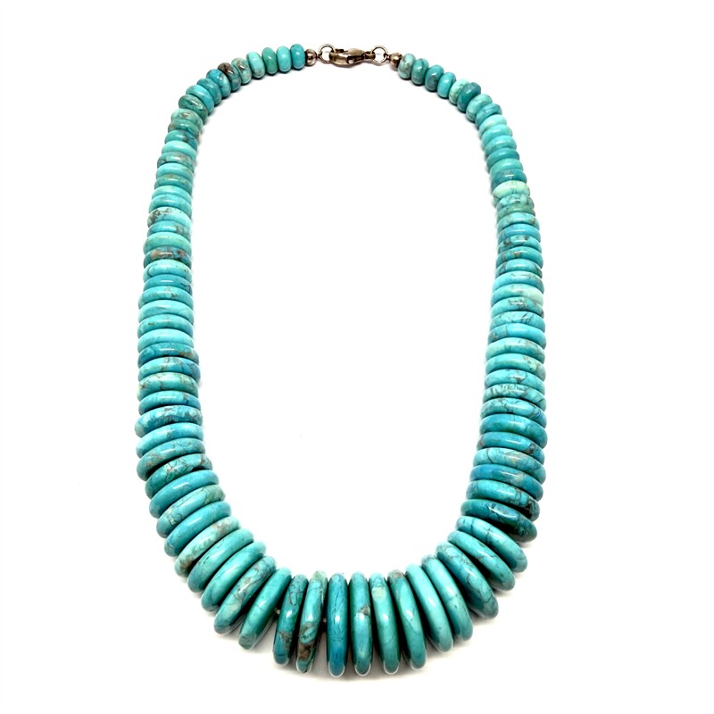 Nepřehlédnutý, designový náhrdelník z tyrkysového magnezitu. Náhrdelník dlouhý cca 46 cm je zakončen zapínáním ze sterlingového stříbra. Celková váha šperku 162,45 g. Výborný stav.