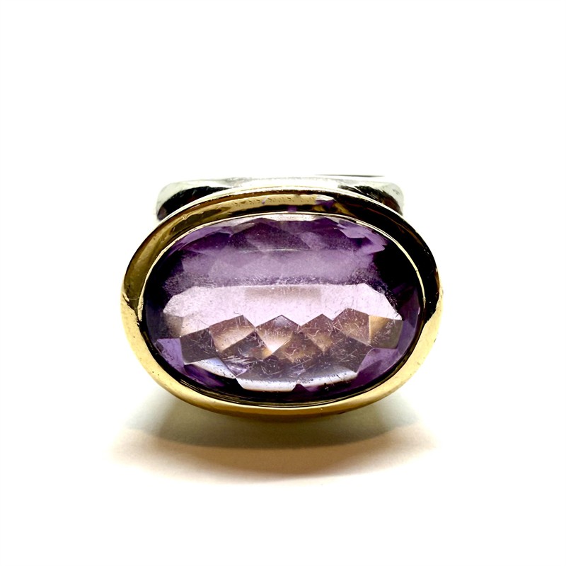 Efektní, minimalisticky ztvárněný, designový prsten. Šperk byl vyroben ze sterlingového stříbra (925/1000) v kombinaci se 14ti karátovým zlatem (585/1000 - dle puncovního úřadu 6,00 g). Značeno puncem pro oba drahé kovy. Šperku vévodí velký, rafinovaně vybroušený ametyst. Celková váha 16,16 g. Velikost 55. Profesionálně vyleštěno zlatníkem, perfektní stav. Šperk vyniká mimořádnou kvalitou zpracování a užitých materiálů.