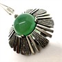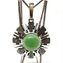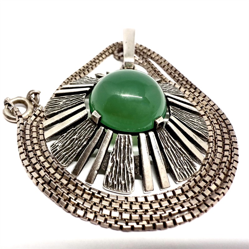 Výrazný stříbrný náhrdelník - delší řetízek typu kostka s odnímatelným, větším závěsem. Šperk zdobí hladce broušený kabošon sytě zeleného chryzoprasu. Stříbro ryzosti 835/1000. Řetízek sterlingové stříbro (925/1000), délka 55 cm. Průměr závěsu 3,5 cm. Perfektní stav.