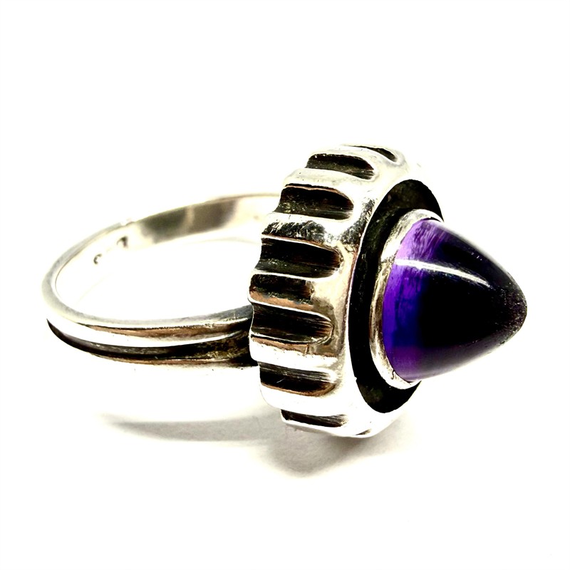 Nevšední, designový prsten ze stříbra. Šperku vévodí sytě fialový ametyst hladkého brusu, zaobleného tvaru kužele. Prsten byl vyroben ze stříbra ryzosti 835/1000, o celkové váze 7,95 g. Velikost 57,5. Prsten byl profesionálně vyčištěn.