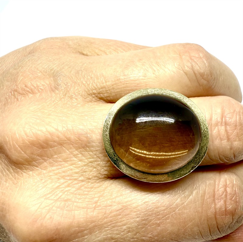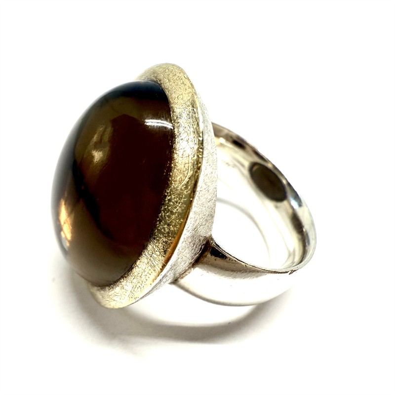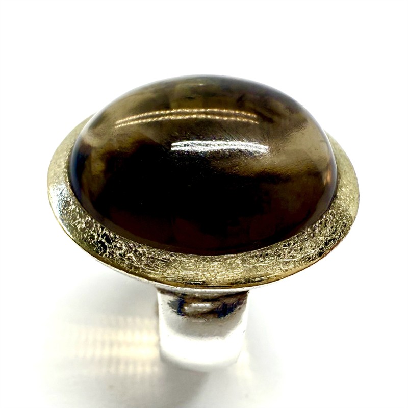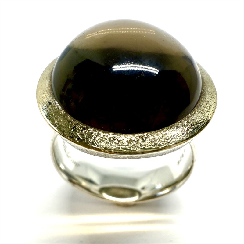 Výrazný stříbrný prsten zhotovený v nadčasovém, minimalistickým stylu. Šperk byl vyroben ze sterlingového stříbra (925/1000), o celkové váze 14,30 g. Prstenu vévodí velký kouřový topaz hladkého brusu. Kámen rámuje kontrastně zlacená cargle s matovaným povrchem. Velikost 57. Profesionálně vyčištěno, perfektní stav.