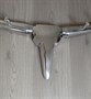 Designový věšák, stylově minimalistické ztvárnění býčí hlavy s rohy, rozměry šířka 100 cm, výška 40 cm, hloubka 10 cm, hmotnost cca 5 kg, materiál vysoce leštěný hliník. Mohutná pevná konstrukce, 4 kolíky pro pověšení oděvů, perfektní stav a vzhled.