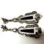 Výrazné, dlouhé, stříbrné náušnice se zapínáním na puzetu. Náušnice zdobí černý onyx, kontrastně dozdobený elegantními markazity. Sterlingové stříbro (925/1000), celková váha 11,86 g. Délka 6 cm. Perfektní stav.
