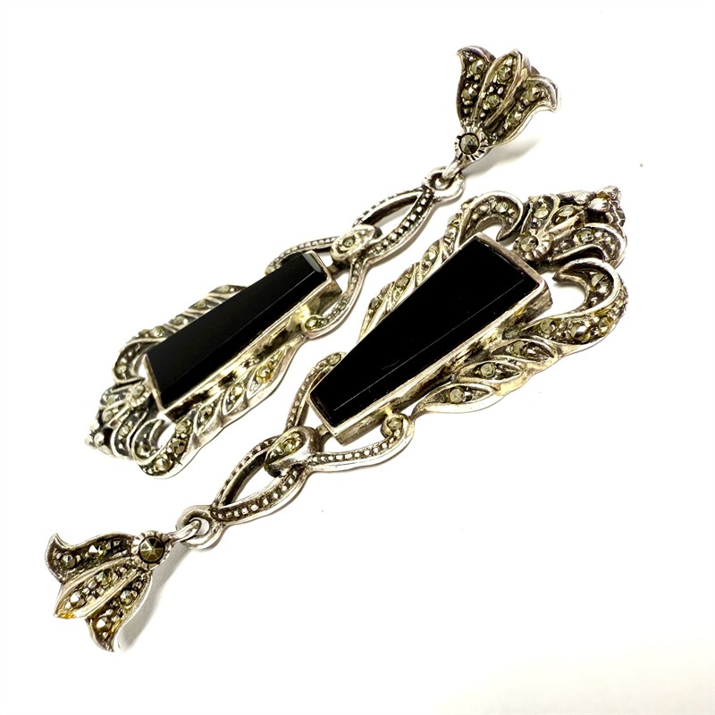Dlouhé stříbrné náušnice s onyxem a markazity