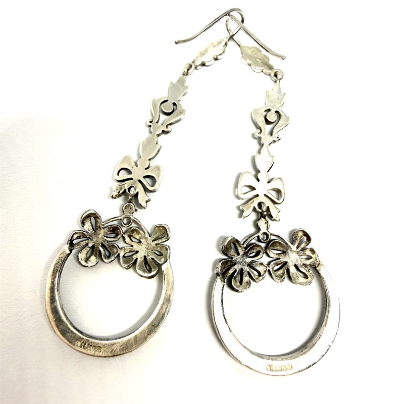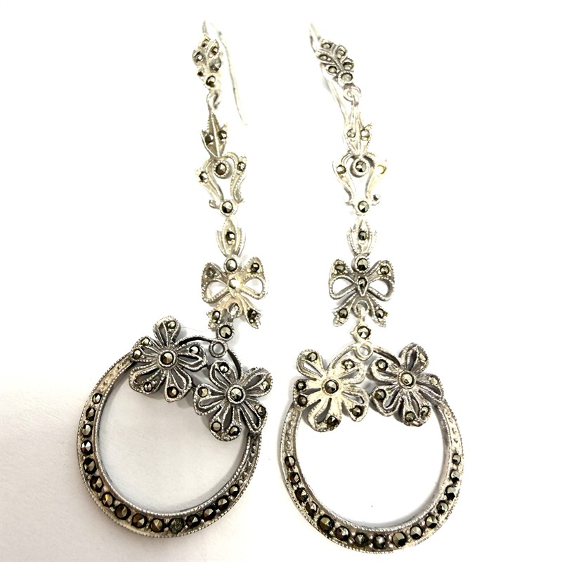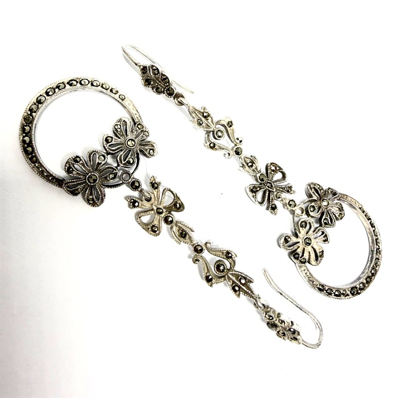 Dlouhé, závěsné náušnice jsou bohatě zdobené elegantně se třpytícími markazity. Zhotoveny ze stříbra sterlingové ryzosti (925/1000), o celkové váze 7,90 g. Délka cca 6,5 cm. Výborný stav.