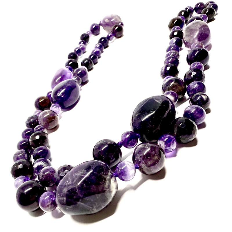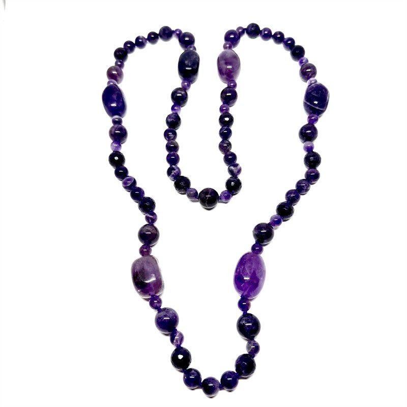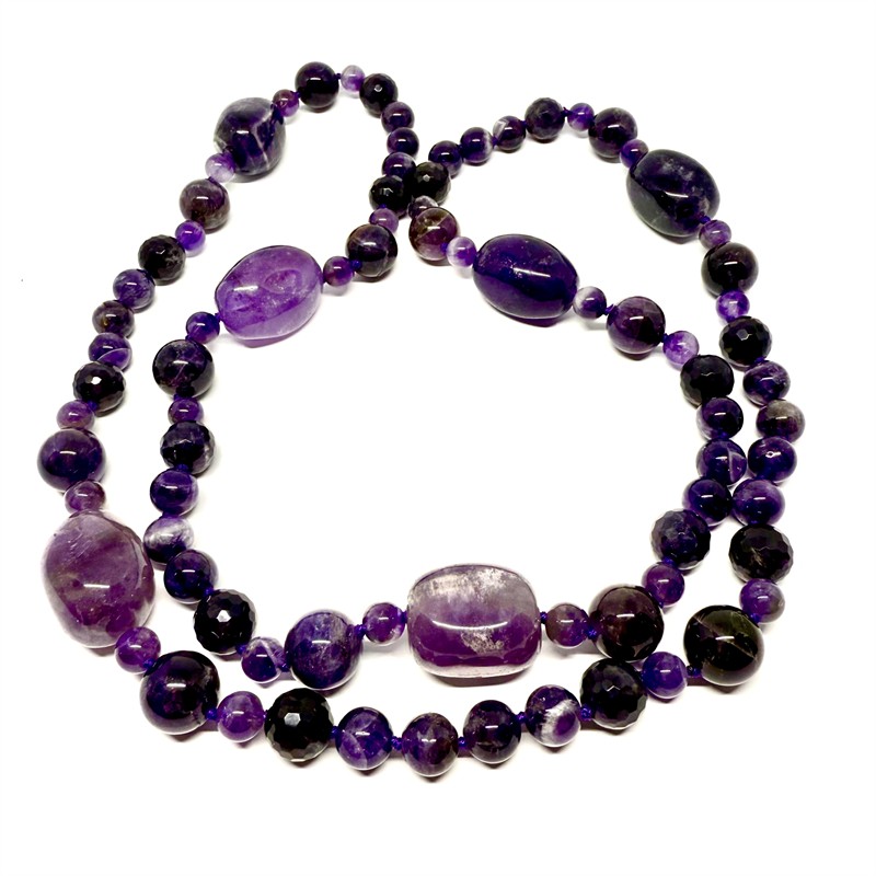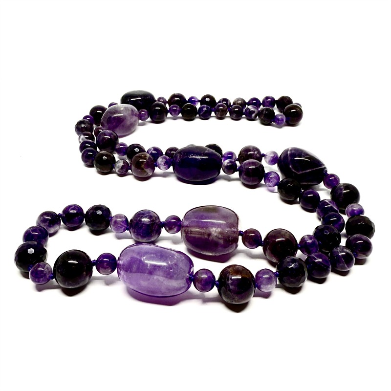 Dlouhý, nepřehlédnutelný náhrdelník z přírodních ametystů různých velikostí tmavšího, sytého fialového odstínu. Každý z kamenů je pečlivě prouzlíkován. Délka 98 cm. Výborný stav.