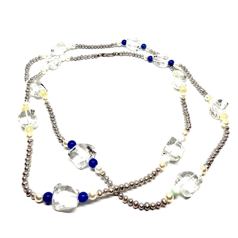 Půvabný, dlouhý náhrdelník zhotovený z říčních perel v barvě holubí šedi, jiskrných horských křištálů a decentních chalcedonů. Šperk o délce 107 cm je zakončen minimalistickým zapínáním ze sterlingového stříbra 925/1000. Možnost nošení na vícero způsobů - dvojitě, nebo jako dlouhý náhrdelník. Perfektní stav.