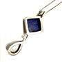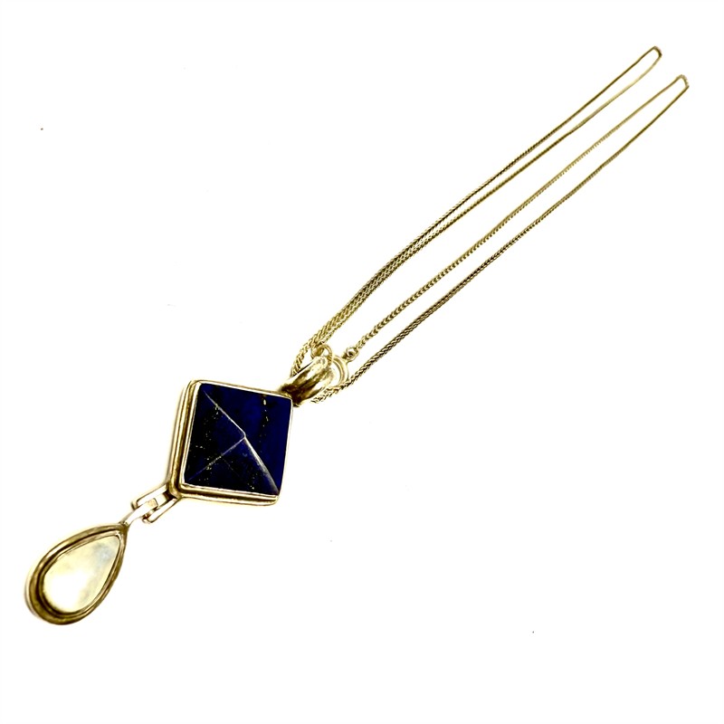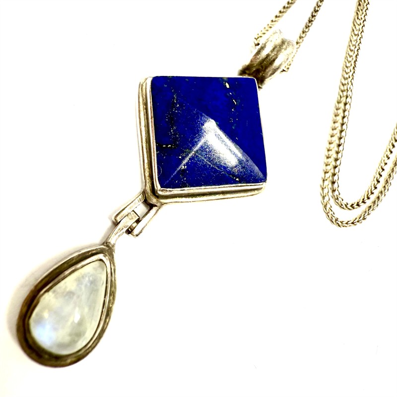 Půvabný, dlouhý, stříbrný náhrdelník. Šperk zdobí odnímatelný závěs zdobený lápisem lazuli a ověsem s měsíčním kamenem. Šperk byl vyroben ze stříbra ryzosti 925/1000. Řetízek délky 70 cm - stříbro 835/1000. Celková váha šperku 13,21 g. Originální šperk ve výborném stavu.