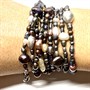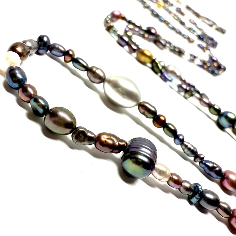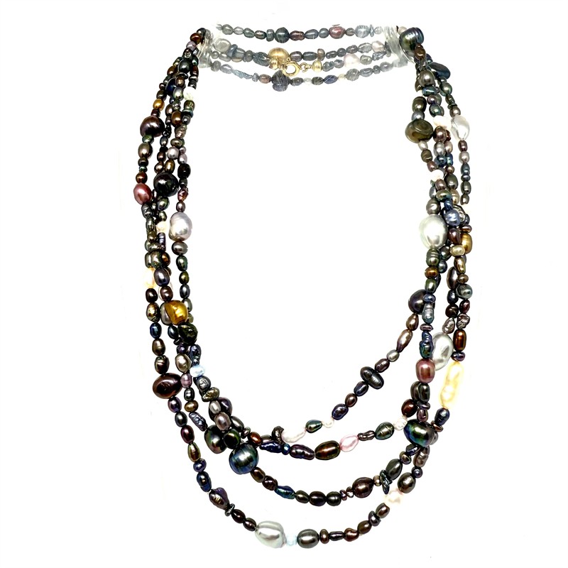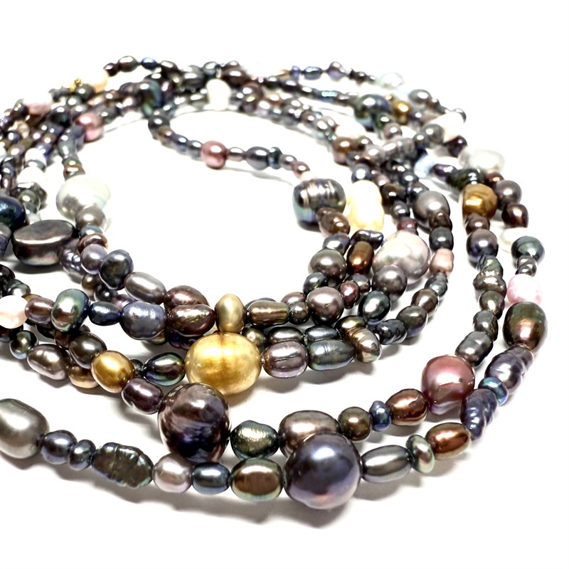 Půvabný, velmi dlouhý náhrdelník z říčních perel různých tvarů, barev a velikostí. Převládají perly tmavé, proložené perlami světlými. Díky délce 168 cm skýtá šperk vícero možností užití. Perly se pyšní půvabnými červánkovými odlesky. Šperk je ukončen zapínáním ze zlata o ryzosti 8 karátů (333/1000). Perfektní stav.