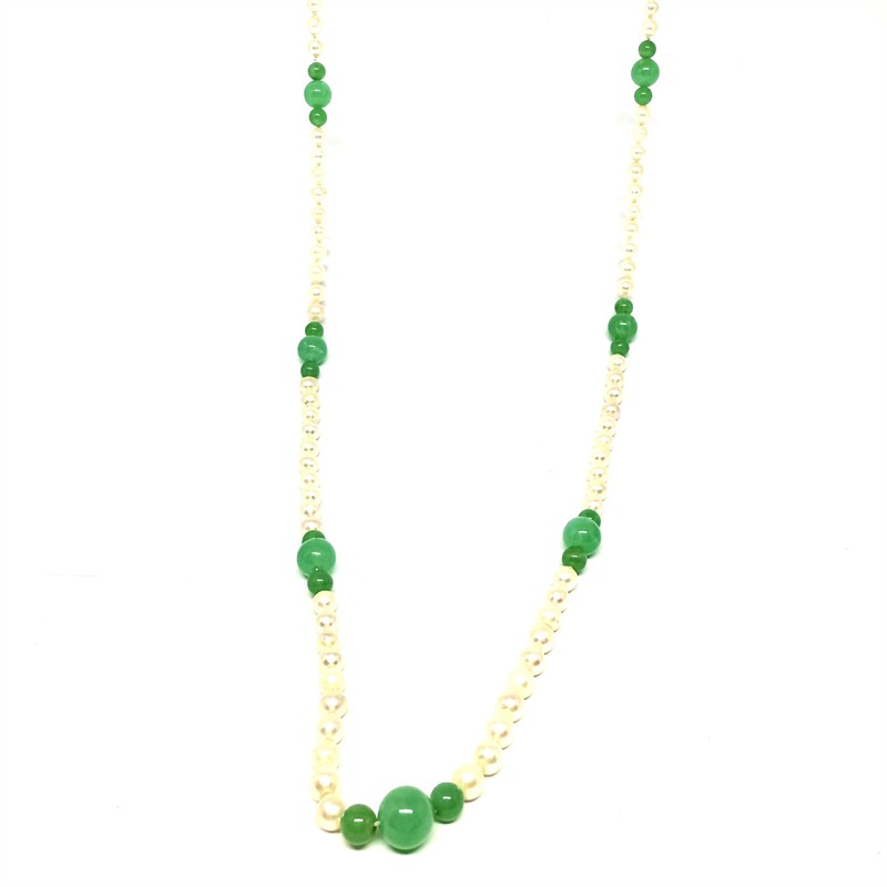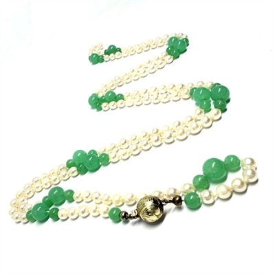 Elegantní, nadčasový náhrdelník z bílých perel se zlatým zapínáním. Perly jsou kontrastně proloženy chryzoprasy rozdílných velikostí. Šperk byl zhotoven ve stylu Art deco v první polovině 20.století a díky úctyhodné délce 102 cm může být nošen vícero způsoby. Perly jsou precizně prouzlíkovány. Náhrdelník je zakončen zapínáním ze 14ti karátového zlata (585/1000) v podobě kuličky zdobené gravírováním. Celková váha šperku 35,17 g. Přístavky z obecného kovu. Ke šperku je zhotoveno osvědčení Puncovního úřadu.