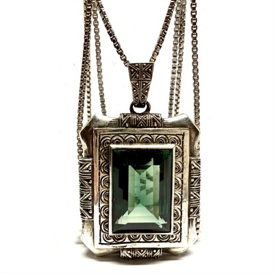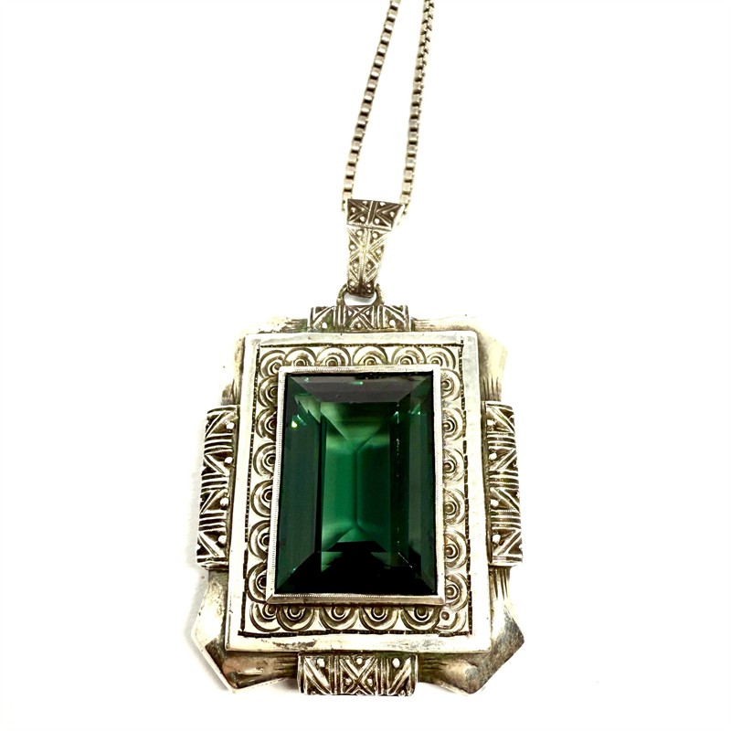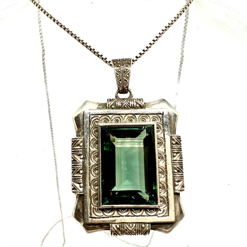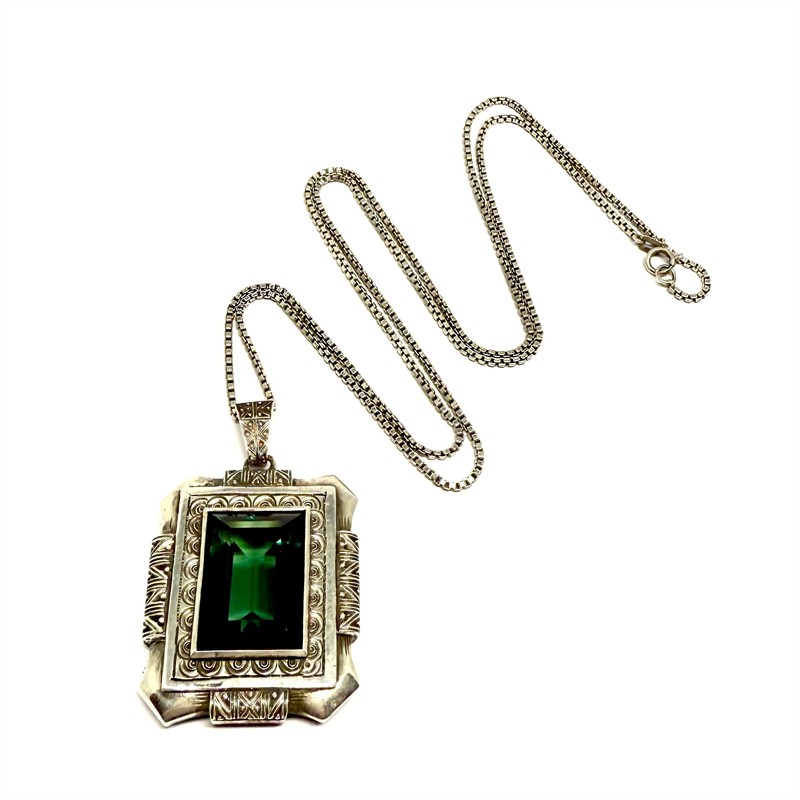 Výrazný, monumentální stříbrný náhrdelník - delší řetízek typu kostka s větším závěsem. Šperku dominuje tmavě zelený spinel. Kámen rámuje zdobný, plastický rámeček. Šperk byl zhotoven ze stříbra ryzosti 835/1000. Celková váha 33,17 g. Perfektní stav.