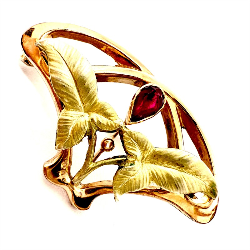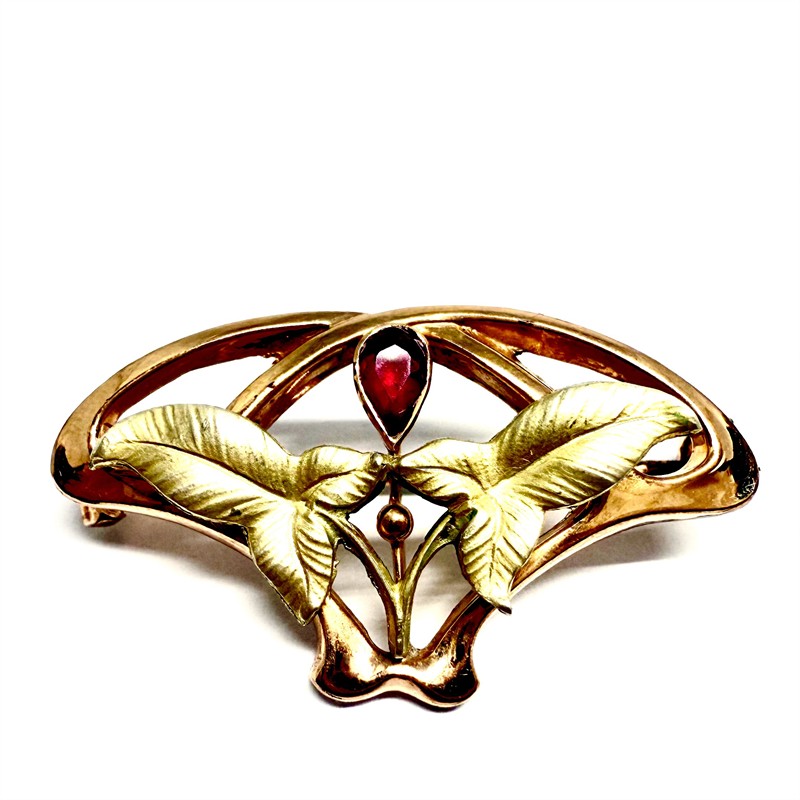 Velmi půvabná brož zhotovená z tzv. double (silně zlaceného obecného kovu) v první polovině 20.století. Rozměry cca 1,5 x 3 cm. Autentický secesní šperk v perfektním stavu.