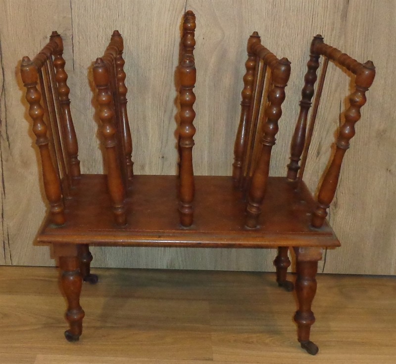 Dřevěný stojan na noviny či noty nebo něco podobného,pojízdný,čtyři otočná,kovová kolečka,nálezový stav,na boku chybí dvě šprušle,viz foto,rozměr 51x51x33 cm.