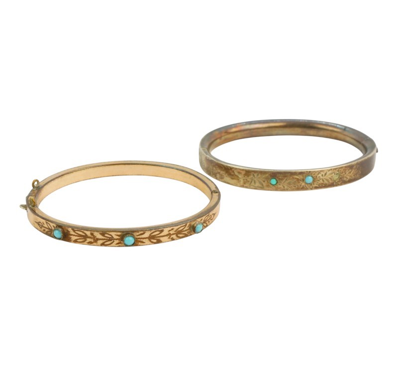 Dva dětské náramky vyrobené z tombaku zdobené tyrkysy a gravírováním. (jeden tyrkys chybí) Rozměry obou cca 5,0 x 4,5 cm. Příležitost začít zdobit také dcerky či vnučky.