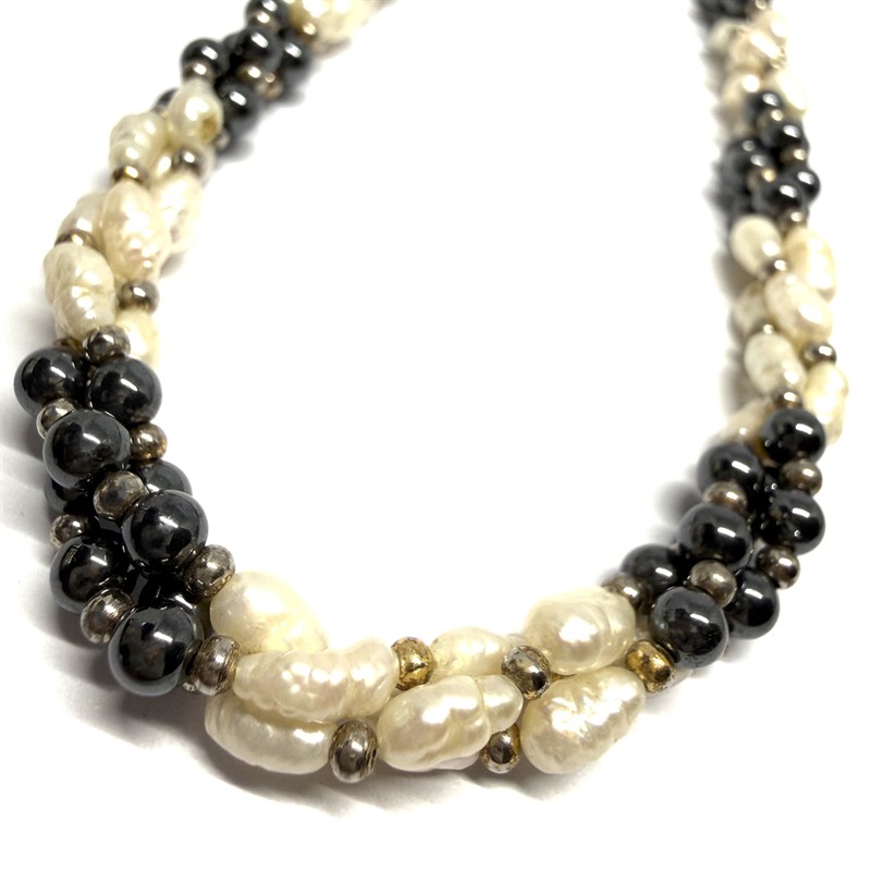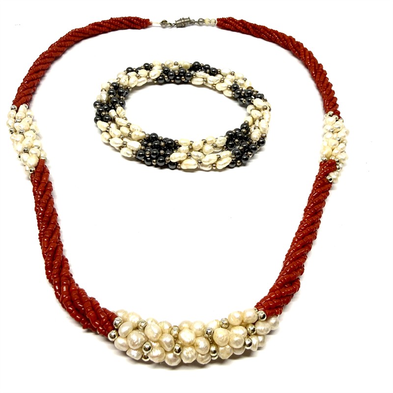 Dva půvabné, velmi efektní náhrdelníky s bílými říčními perlami. První náhrdelník byl spleten ze třech řad elegantních, tmavých hematitů a kontrastních, bílých, říčních perel. Délka 45 cm. Karabina ze zlaceného stříbra sterlingové ryzosti (925/1000). Druhý náhrdelník tvoří stovky drobných, sytě červených korálů zdobených říčními perlami. Délka 46,5 cm. Oba šperky jsou ve velmi dobrém stavu.