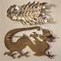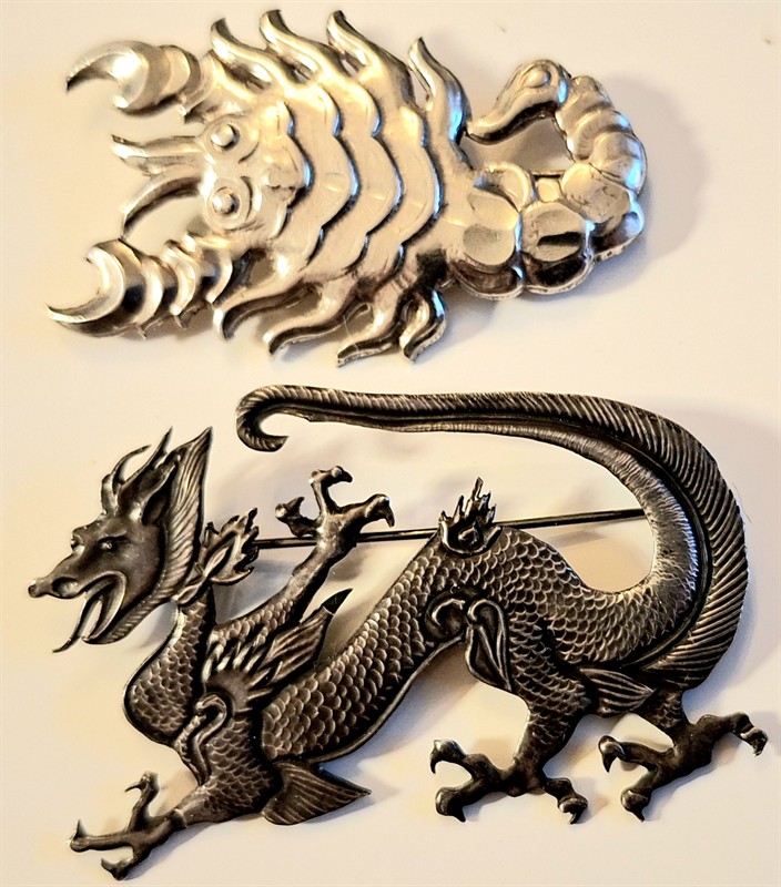 Tepaná stříbrná brož - rak, stříbro 800/1000- trojúhelník 5, rozměr 6 x 3,8, hmotnost 7g, art deco, 40. léta m.s. Bazilišek, kombinovaná brož – tepaný stříbrný plech s jádrem z obeckého kovu, neznačeno, pravděpodobně Státní odborná škola šperkařská v Turnově, 20. léta m.s. art deco, rozměr 4,5 cm x 7 cm, hmotnost 13 g, intaktní stav