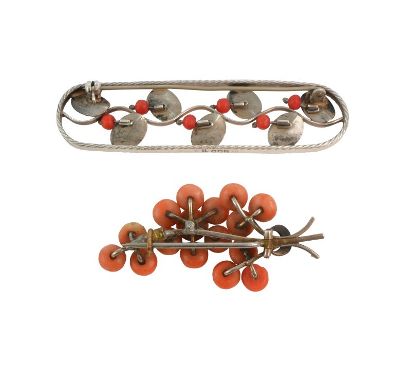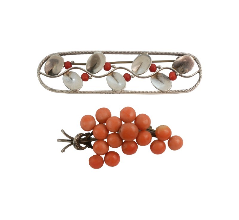 Stříbrná brož ve tvaru hroznu s kuličkami ze středomořského červeného korálu (16 ks), stříbro puncováno 800/1000, 30. léta 20.století, art deco, 6,08 g, 48 x 25 mm. Velká stříbrná brož s listy a korály, stříbrná brož ve stylu art deco s listy doplněná kukličkami rudého středomořského korálu, stříbro 800/1000, 30. léta 20. století. Rozměr 6,5 x 1,5 cm, hmotnost 7,04 g.