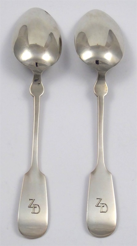 Stříbro. Ryzost Ag 800/1000, celková hmotnost 105,73 g. Vídeňský stříbrník Stefan Kleindienst. Dvě stříbrné lžíce vejčitého tvaru s klenutou rukojetí s prstencem se zúženým středem a rozšířenou dolní částí. Na zadní straně rukojetí gravírovaný stylizovaný monogram "ZD". Značeno: rakousko-uherský punc a mistrovská značka. Rakousko-Uhersko, Vídeň 1866 - 1922. Délka 20,5 cm.