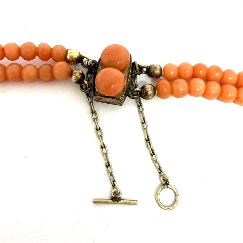 Výrazný, velmi starý korálový náhrdelník. Šperk tvoří dvě řady velkých, vysoce kvalitních korálů sytého lososovitého odstínu. Náhrdelník je dlouhý cca 53 cm, zakončen dekorativním zapínáním se dvěma korály s pojistným řetízkem. Náhrdelník je ve výborném stavu.