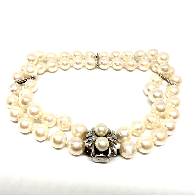 Elegantní náramek tvořený dvěma řadami bílých perel o průměru 6,3 mm. Zdobné, dekorativní zapínání vyrobené ze stříbra ryzosti 925/1000 (Sterling). Každá z perel je pečlivě prouzlíkovaná. Délka 20,5 cm. Šperk je vhodný na statnější zápěstí. Výborný stav.