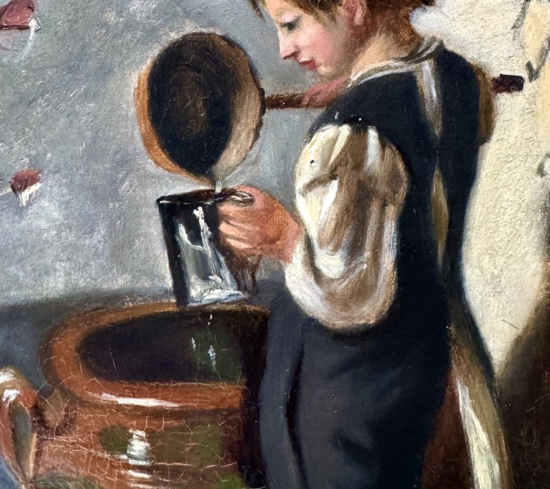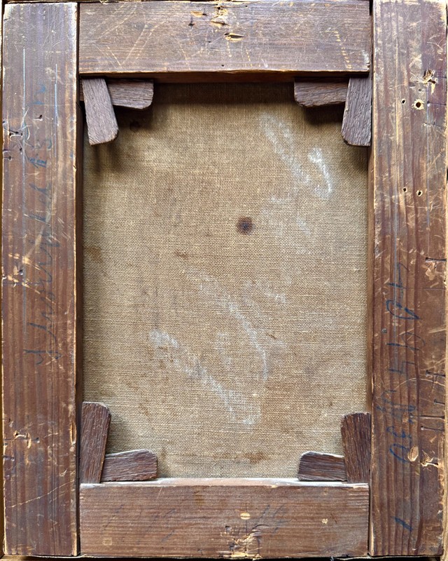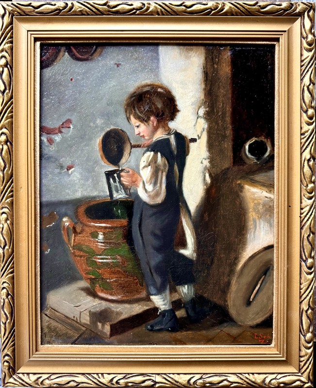 Hezký olej na plátně o celkové velikosti s rámem je 35 x 29 cm, velikost malby je 29 x 23 cm. Signováno a datováno vpravo dole. Eduard Schönbeck (1839 -1885) byl německý malíř krajin a žánrů.