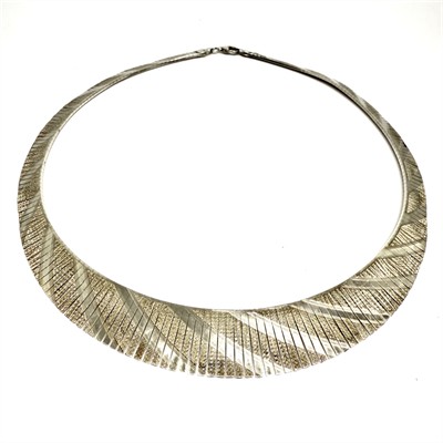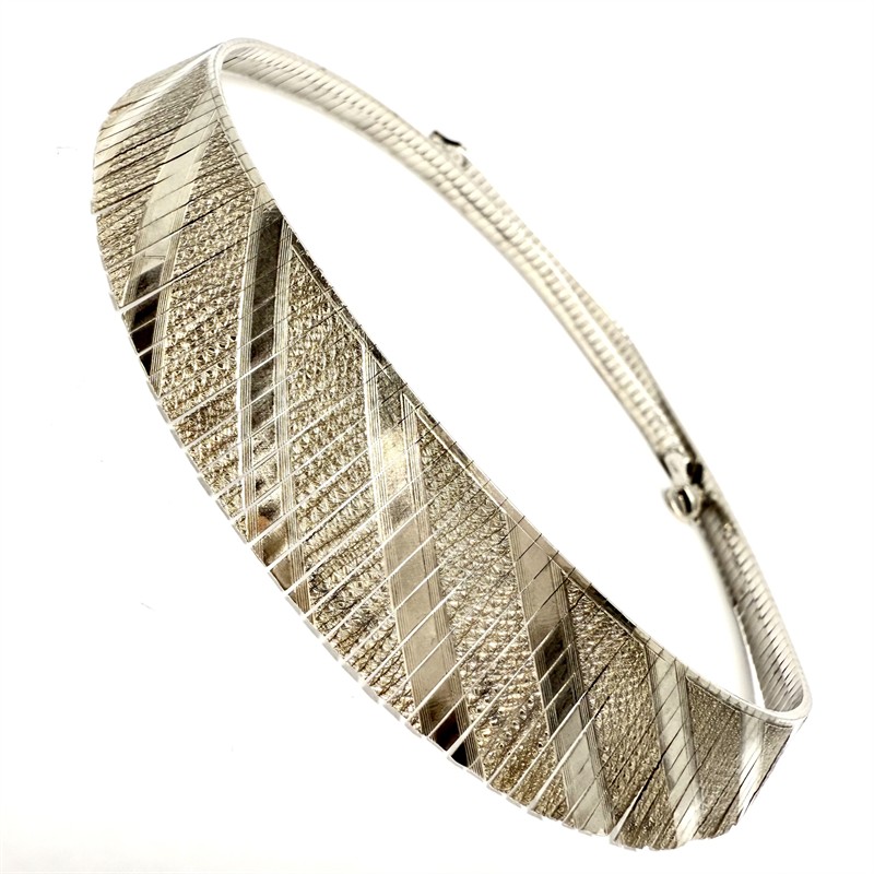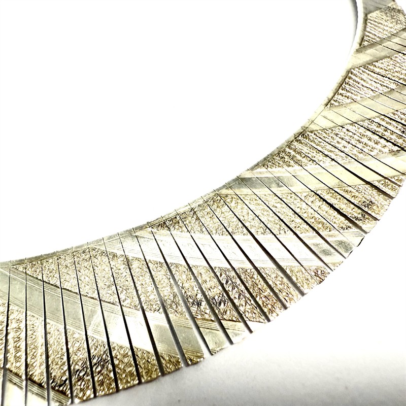 Efektní, široký, designový náhrdelník ze stříbra. Šperk byl vyroben ze sterlingového stříbra (925/1000), o celkové váze 27,28 g. Délka 45 cm, náhrdelník se postupně ke středu rozšiřuje - šířka 6 až 18 mm. Náhrdelník byl profesionálně vyčištěn zlatníkem a je ve výborném stavu.