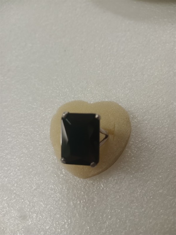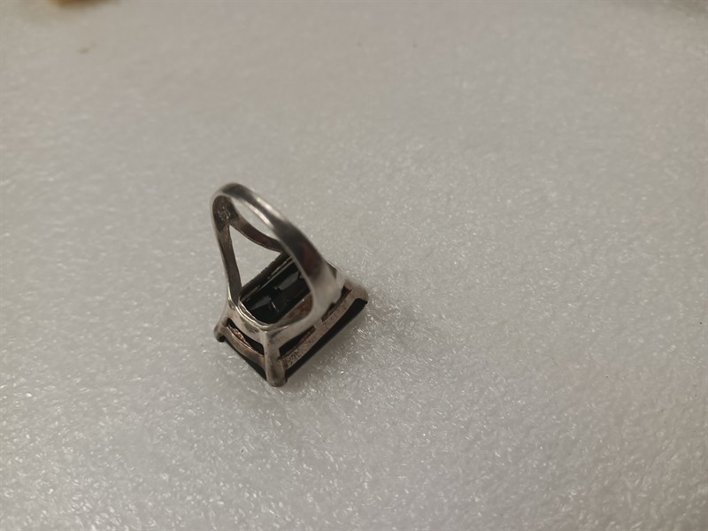 Elegantní výrazný prsten vyrobený ze stříbra ryzosti 780/1000, s černým kamenem broušeným do faset. Hlava prstenu má rozměry 2 x 1,5 cm . Hrubá hmotnost 11,72 gr. Velikost prstenu je 54 . Přiložena boleta Puncovního úřadu.