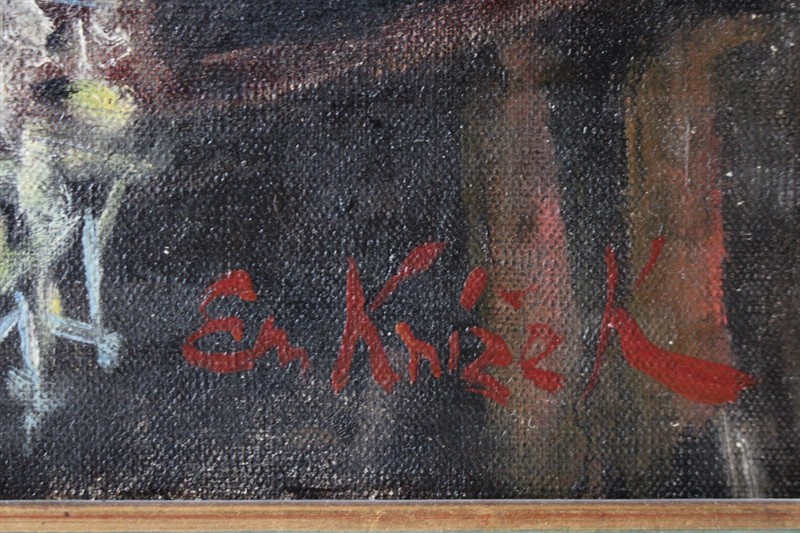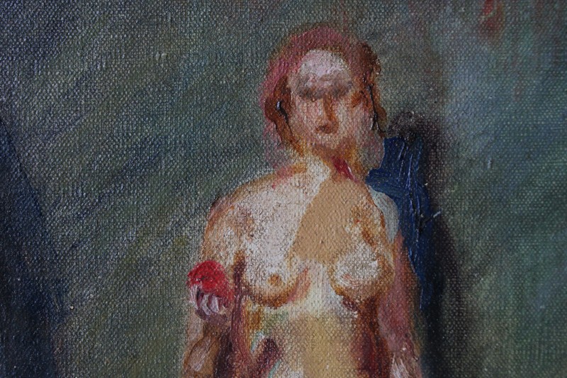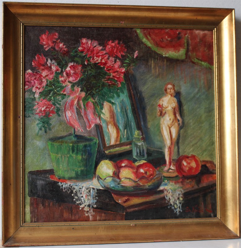 Emanuel Knížek (*1889) - Zátiší s dívčím aktem Signováno viz foto. Olej na plátně. Rozměry malba: 60 x 60 cm